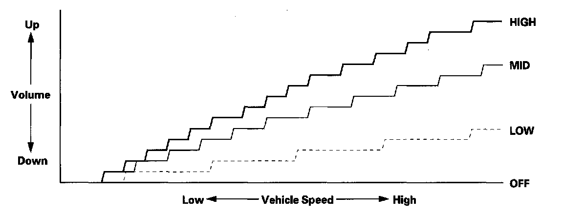 Some audio systems are equipped with speed-sensitive volume compensation (SVC). The navigation or audio unit receives the vehicle speed pulse (VSP) from the ECM/PCM. The system processes the speed input and increases the navigation or audio system volume level as the vehicle speed increases to compensate for the various interior noises that occur at higher speeds. When the vehicle slows down, the volume returns to its normal level. The SVC has four settings: SVC OFF, LOW, MID and HIGH that can be adjusted using the navigation or audio unit. The SVC comes from the factory with the MID setting as the default.
