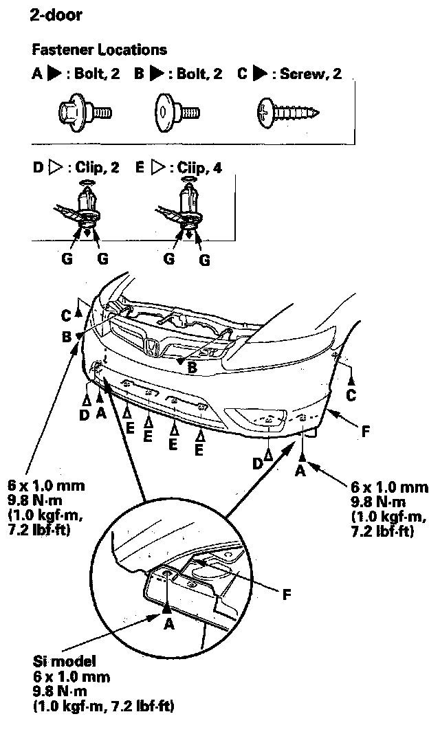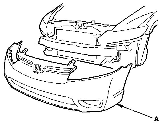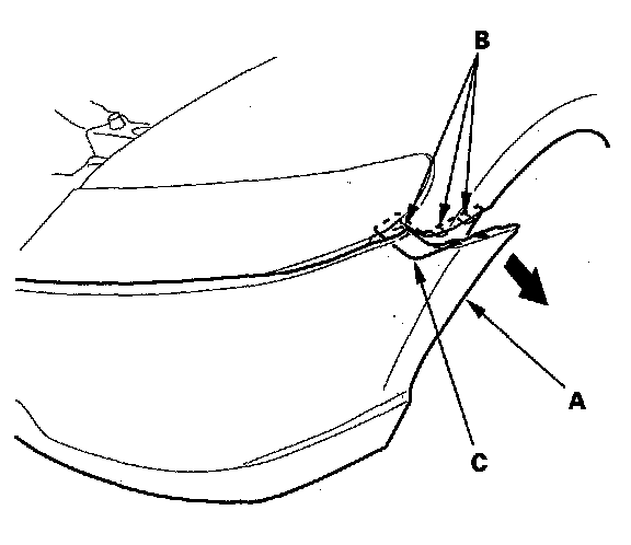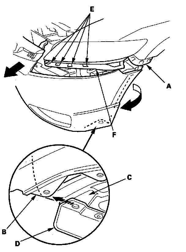 4. With the help of an assistant, while pulling the wheel arch portion away from the side spacer (A) and the lower corner portion (B) away from between the front inner fender (C) and the front strake (D) (Si model 2-door), pull the front bumper to release the bumper from the hooks (E) on the upper beam (F).