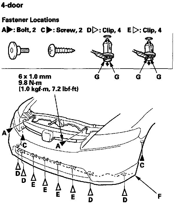 2. Remove the bolts (A, B), screws (C), and clips (D, E) securing the front bumper (F).