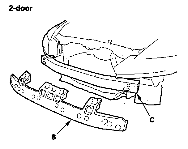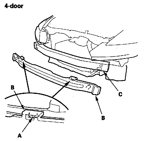 6. Release the hooks (A) (4-door), then remove the front bumper absorber (B) from the front bumper beam (C).