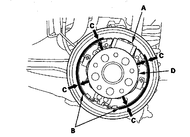 6. Measure the brake lining thickness (C). Measurement does not include brake shoe thickness.
