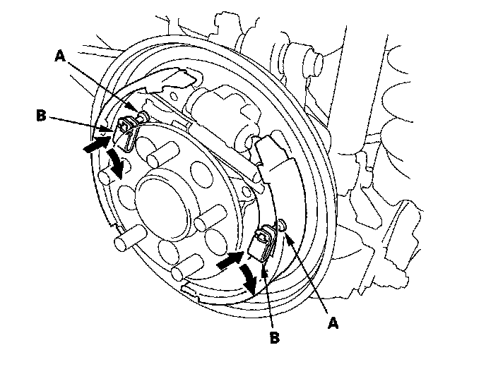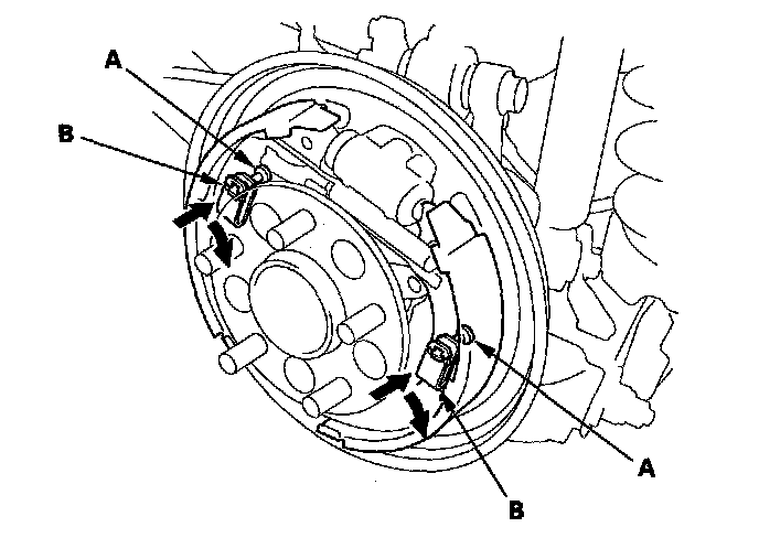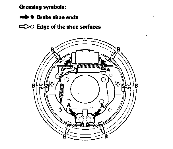 5. Apply a thin coat of Molykote 44MA grease to the shoe ends (A) and to the edge of the shoe surfaces (B) that make contact with the backing plate as shown. Wipe off any excess. Keep grease off the brake linings.
