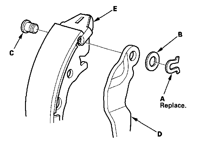 8. Remove the U-clip (A), wave washer (B), and pivot pin (C), and separate the parking brake lever (D) from the brake shoe (E).