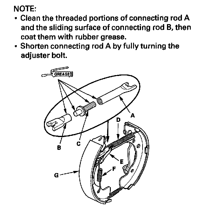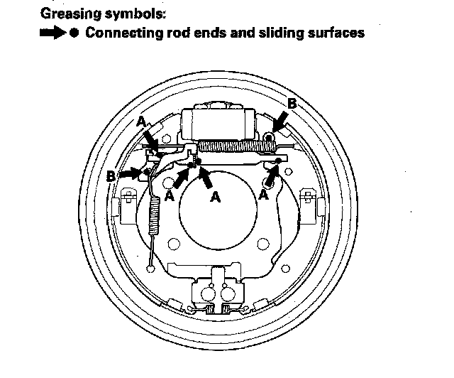 4. Apply a thin coat of rubber grease to the connecting rod ends (A), and the sliding surfaces (B) as shown. Wipe off any excess. Keep grease off the brake linings.