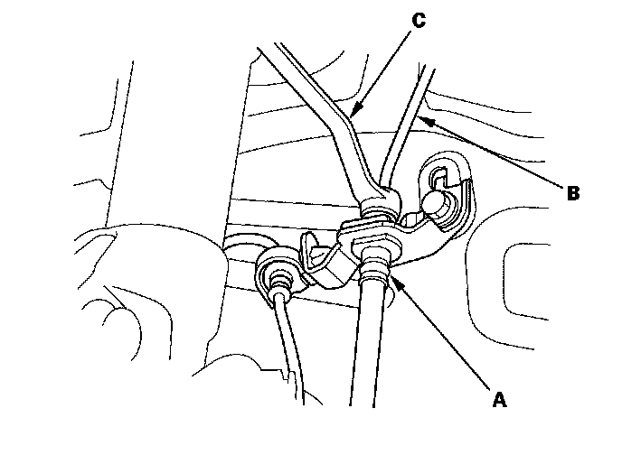 ^ With clip type: Install the brake hose on the brake hose bracket (B) with a new brake hose clip (C).