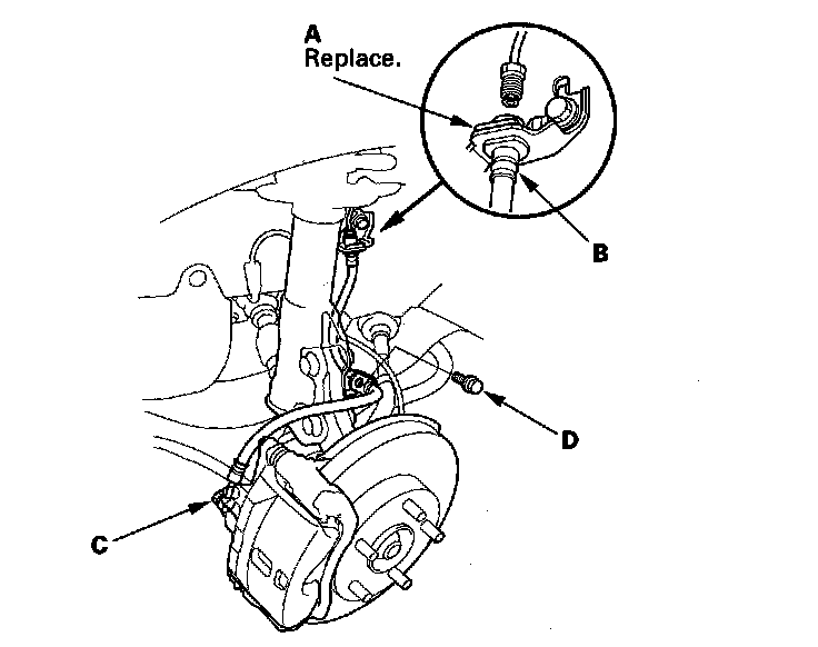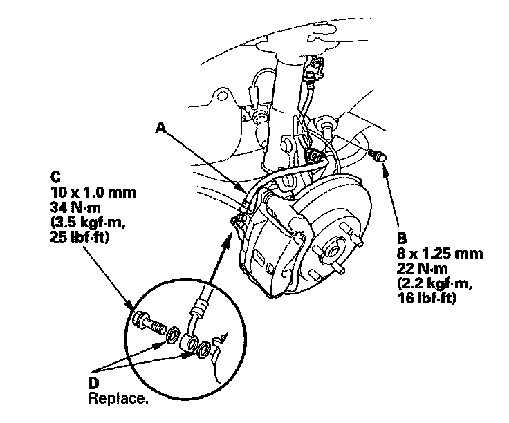 5. Remove the brake hose mounting bolt(s) (D), then remove the brake hose.