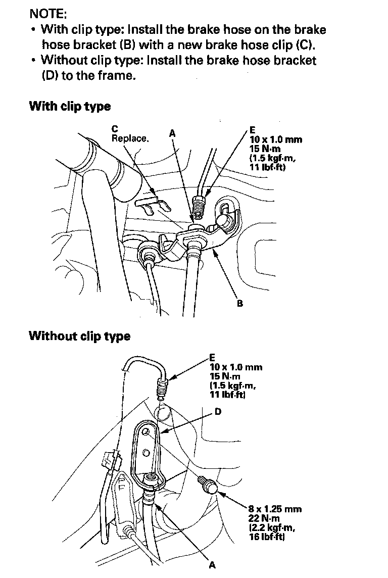 ^ Without clip type: Install the brake hose bracket (D) to the frame.