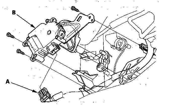 2. Disconnect the 7P connector (A) from the air mix control motor (B). Remove the self-tapping screws and the air mix control motor from the heater unit.