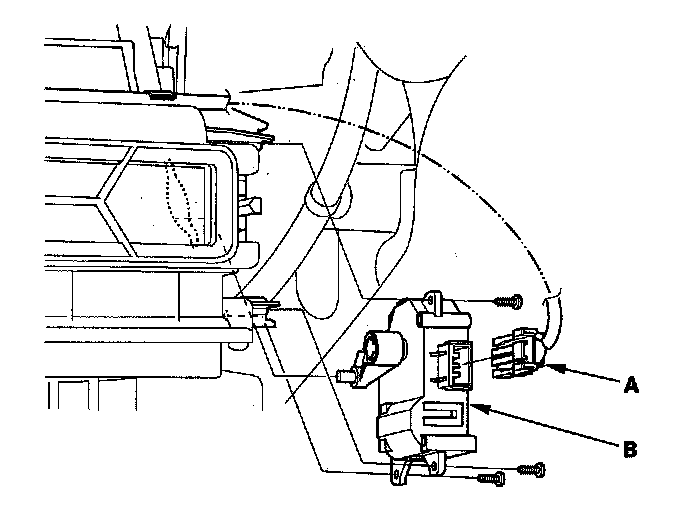 2. Disconnect the 7P connector (A) from the recirculation control motor (B). Remove the self-tapping screws and the recirculation control motor from the blower unit.