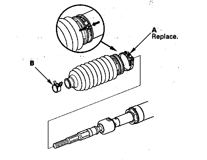 2. Remove the boot bands (A) and tie-rod clips (B). Pull the boot away from the ends of the steering gearbox.