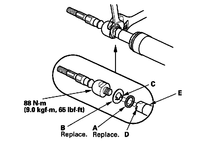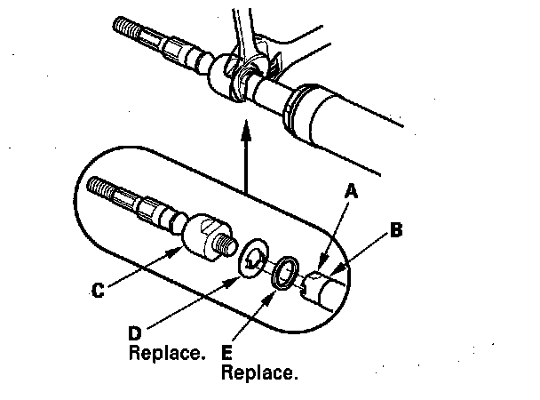 81. Install the new rubber stop (A) and the new lock washer (B). Align the lock washer tabs (C) with the slots (D) on the rack end (E) while holding the lock washer in place. Repeat this step for the other side of the rack shaft.