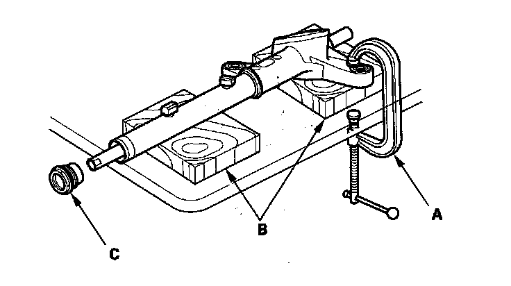 13. Hold the gearbox housing using a C-clamp (commercially available) (A) and the wooden blocks (B) as shown. Do not clamp the cylinder part of the gearbox housing in the vise. Then remove the cylinder end (C).