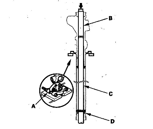 16. Set the steering gearbox-in a press so the gearbox housing side points upward, then press the cylinder end seal (D) and steering rack out of the steering gearbox. Hold the steering rack to keep it from failing when pressed clear. Be careful not to damage the inner surface of the cylinder side on the gearbox housing with the tool.
