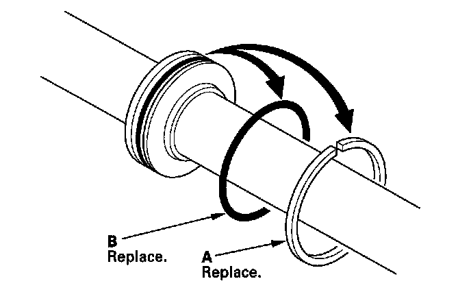 19. Carefully pry the piston seal ring (A) and O-ring (B) off the rack piston. Be careful not to damage the inside of the seal ring groove and piston edges when removing the seal ring.