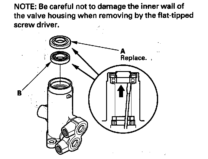 29. Remove the valve oil seal (A) and roller bearing (B) from the valve housing using a flat-tipped screw driver.