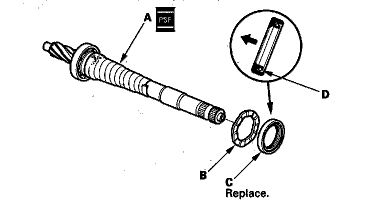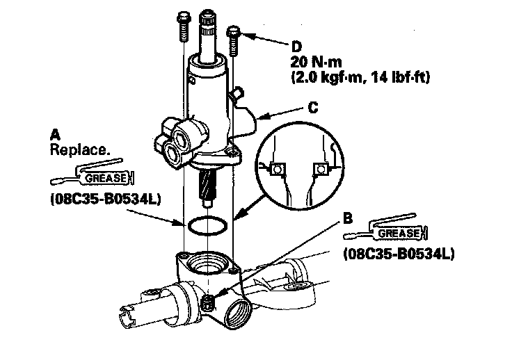 34. Coat the inside surface of the new valve oil seal (C) with power steering fluid, and install the seal with its grooved side facing opposite the bearing, then slide it over the pinion shaft, being careful not to damage its sealing lip (D).