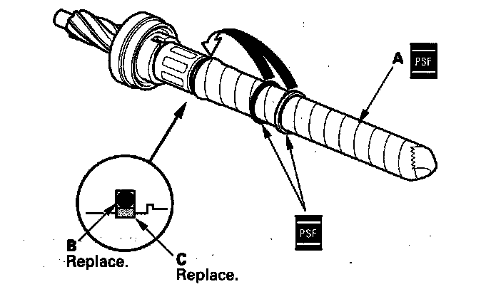 ^ Inspect the ball bearing (C) by rotating the outer race slowly. If there is any excessive play or wear, replace the pinion shaft and sleeve as an assembly.