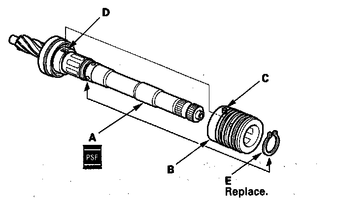 44. Apply power steering fluid to the surface of the pinion shaft (A). Slide the sleeve (B) onto the pinion shaft by aligning the locating pin (C) on the inside of the sleeve with the cutout (D) in the shaft. Then install the new snap ring (E) securely in the pinion shaft groove. Be careful not to damage the valve seal ring when inserting the sleeve.