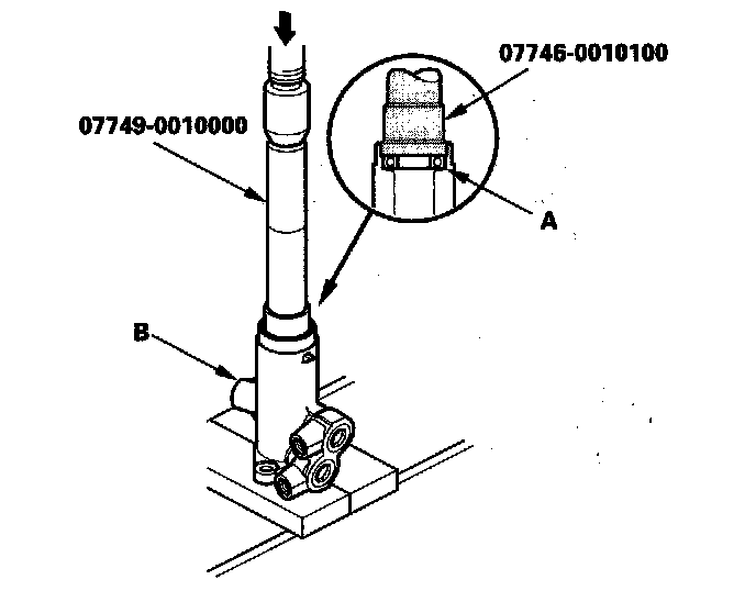 47. Apply power steering fluid to the seal ring lip of the new valve oil seal (A), then install the seal in the valve housing (B) using a hydraulic press, driver, and attachment. Install the seal with its grooved side facing the tool.