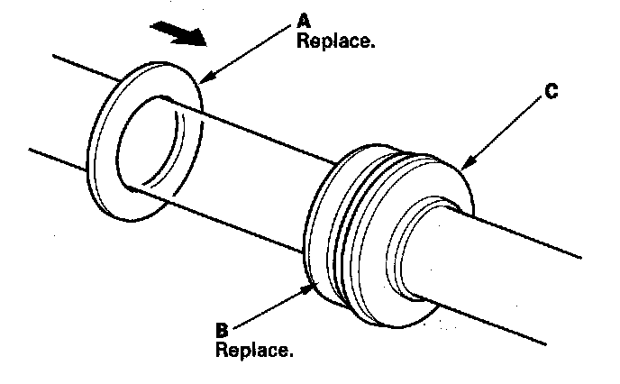 61. Install the new backup ring (A) on the steering rack, then place the backup ring and cylinder end seal (B) against the piston (C).