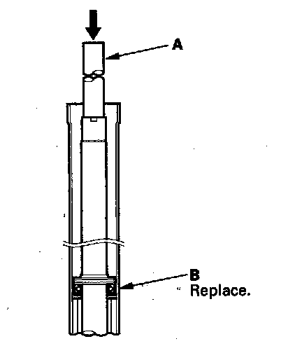 18. Place the steering gearbox in a press, then remove the cylinder end seal (A) and backup ring (B) from the gearbox housing by pressing on the 24" long, 3/8" drive extension.