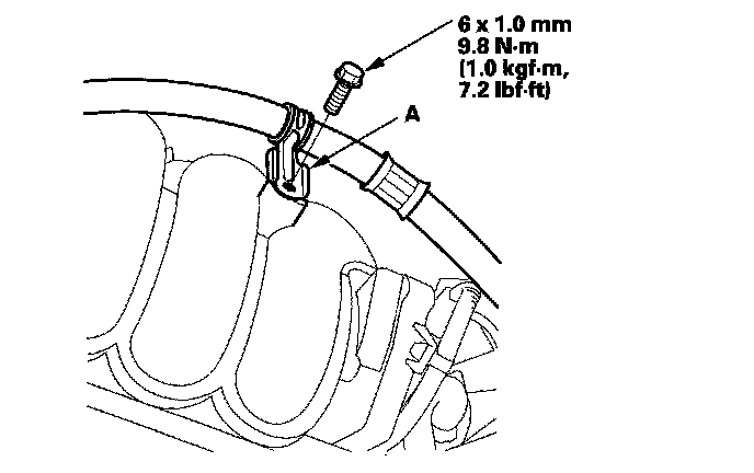 3. Remove the pump outlet hose clamp (A) from the intake manifold.