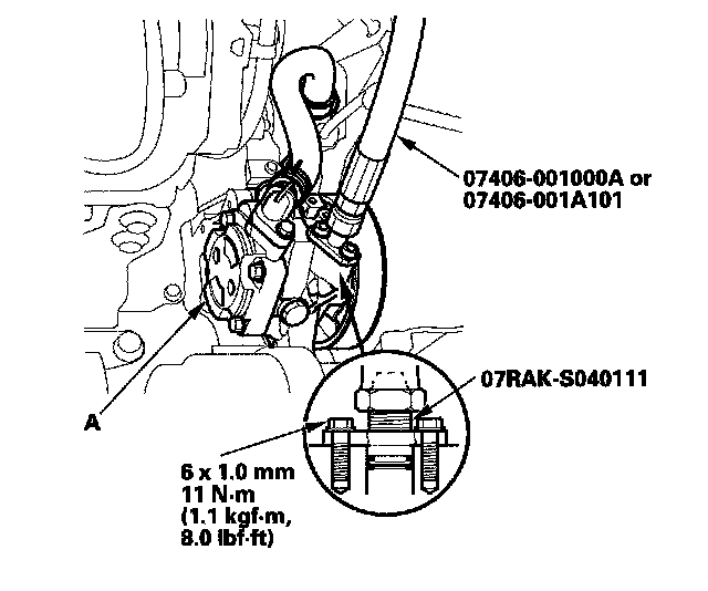 4. Disconnect the pump outlet hose, then install the P/S joint adapter (pump) on the pump (A). Take care so as not to spill the power steering fluid on the frame and other parts.