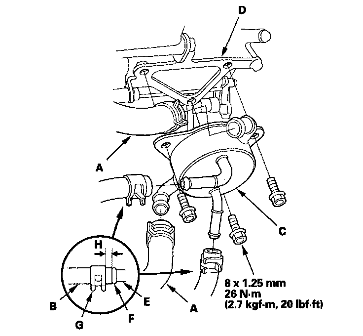 12. Slide the ATF warmer hoses over the ATF warmer lines (E) until the hose ends contact the bulge (F) and secure the hoses with the clip (G) at 6 - 8 mm (0.24 - 0.31 in.) (H) from the hose end.