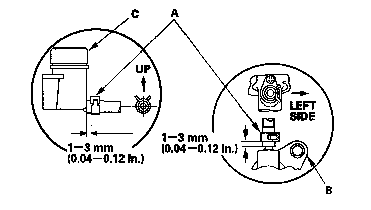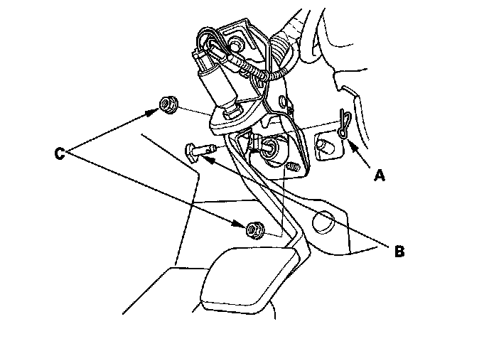 8. Pry out the lock pin (A) and pull the clevis pin (B) out of the yoke. Remove the master cylinder mounting nuts (C).