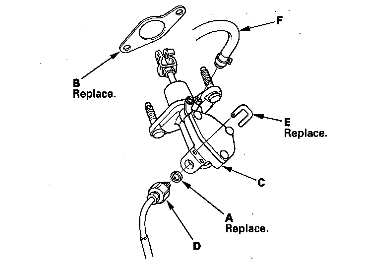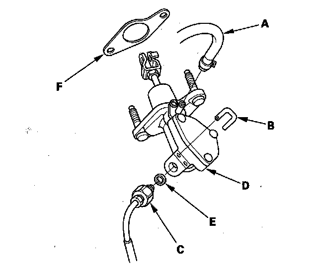 16. Install the clutch line (D), then install the new retaining clip (E). Connect the reservoir hose (F).