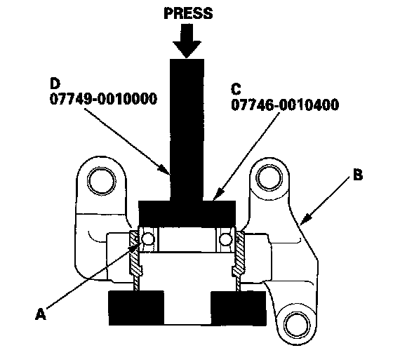 6. Install the new outer seal (A) into the bearing support (B) using the oil seal driver (C) and a press.