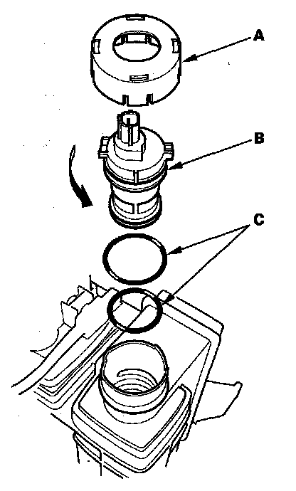 4. Install the parts in the reverse order of removal with new O-rings (C) and a new cap (A).