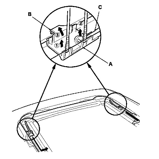 4. Pry up on the deflector arm bases (A) with a flat-tip screwdriver, and release the hooks (B), then remove the bases with the deflector arm springs (C) from both sides.