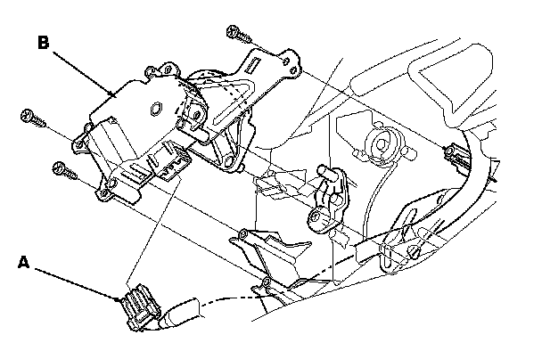 2. Disconnect the 7P connector (A) from the air mix control motor (B). Remove the self-tapping screws and the air mix control motor from the heater unit.