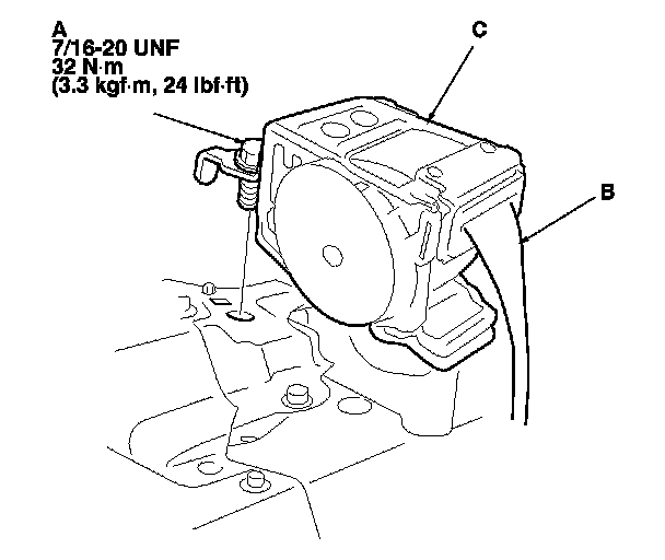 4. Remove the retractor bolt (A), then remove the rear seat belt (B) and the retractor (C).