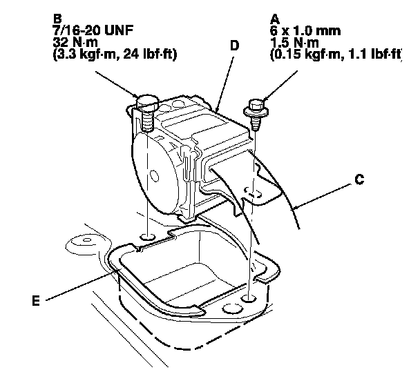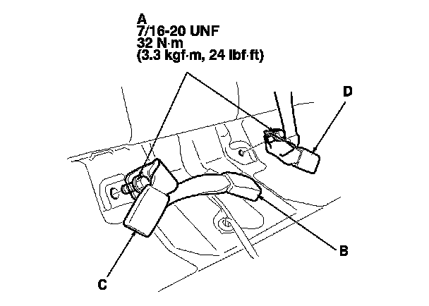 2. Remove the center anchor bolts (A), then remove the right seat belt buckle (B), the center seat belt buckle (C), and the left seat belt buckle (D).