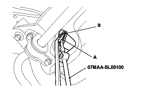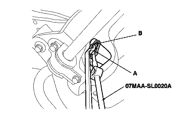 6. Hold the rack guide screw stationary with a wrench, and install the locknut (B) by hand until it's fully seated.