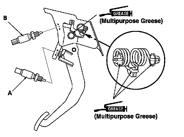 1. Disconnect the clutch pedal position switch connector (A) and the clutch interlock switch connector (B).