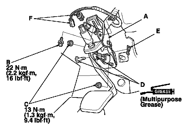 3. Remove the master cylinder mounting nuts (E) and the clutch pedal mounting bolt (F).