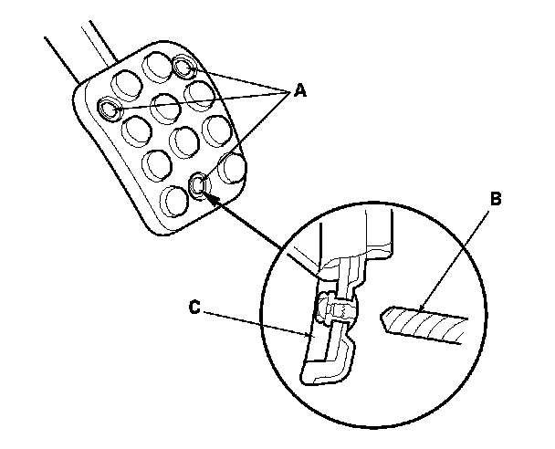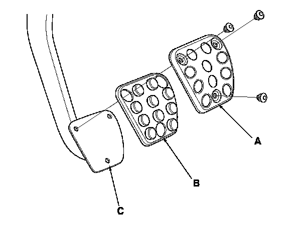 3. Remove the clutch pedal plate (A) and the clutch pedal cover (B) from the clutch pedal pad (C).