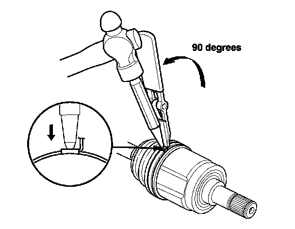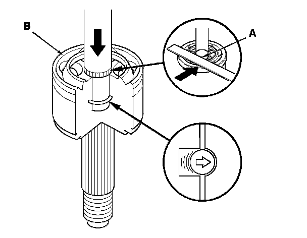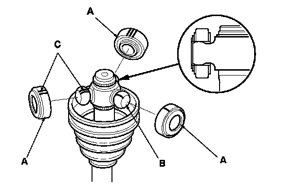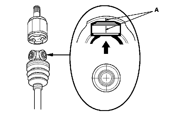 - Reinstall the inboard joint onto the driveshaft by aligning the marks (A) you made on the inboard joint and the rollers.