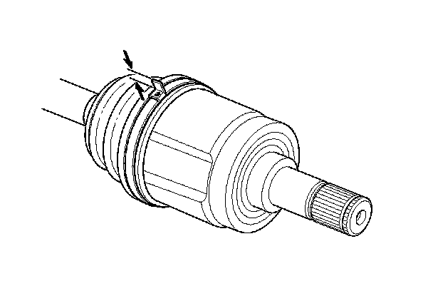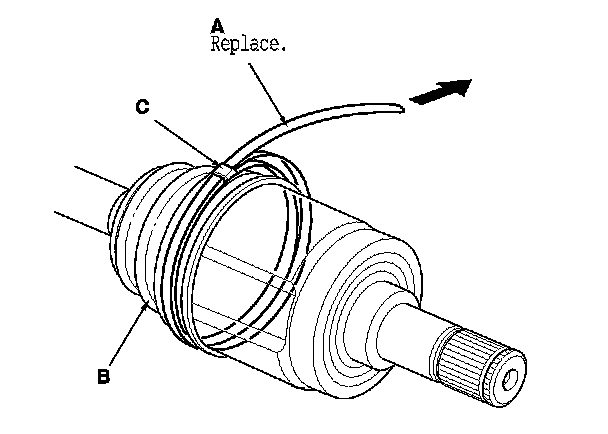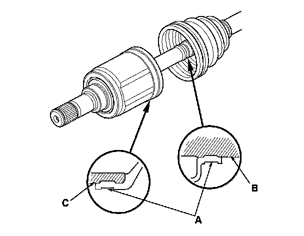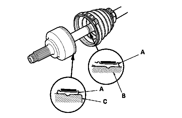 8. Fit the boot ends (A) onto the driveshaft (B) and the inboard joint (C).