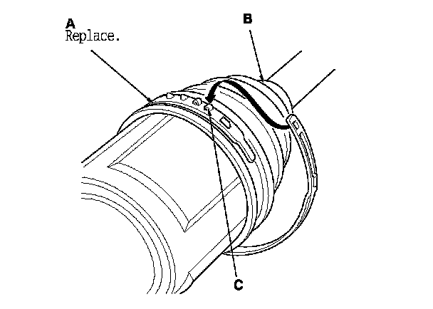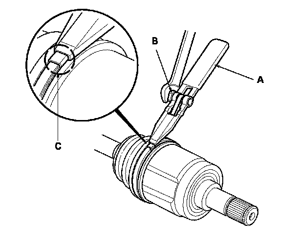 10. Fit the boot ends (A) onto the driveshaft (B) and the outboard joint (C). Bleed any excess air from the boot by inserting a flat-tipped screwdriver between the boot and the joint.