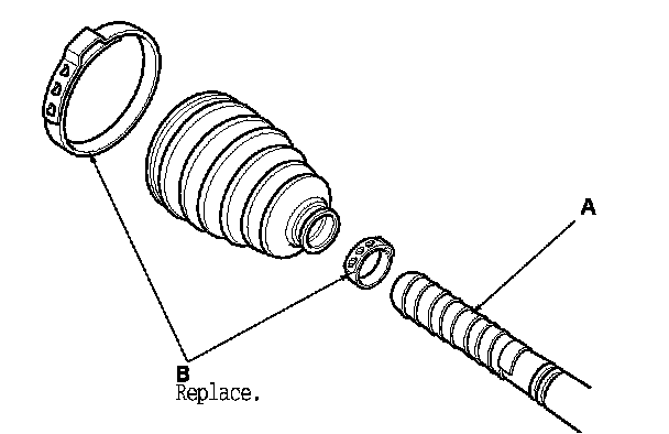 11. Fit the boot ends onto the driveshaft and the inboard joint, then install a new double loop band (A) onto the boot (B).