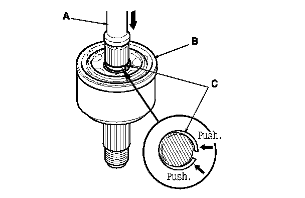 6. Insert the driveshaft (A) into the outboard joint (B) until the stop ring (C) is close to the joint.
