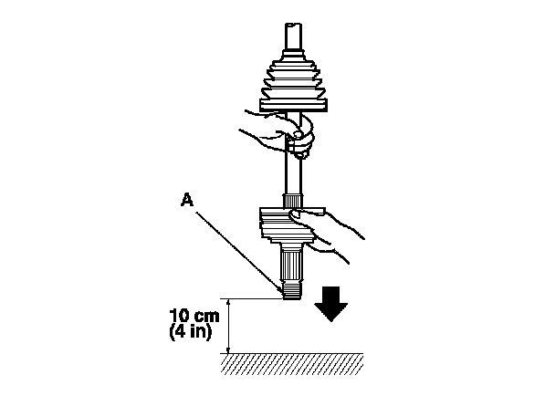 7. To completely seat the outboard joint, pick up the driveshaft and the joint, and tap or hit the assembly onto a hard surface from a height of about 10 cm (4 in)
