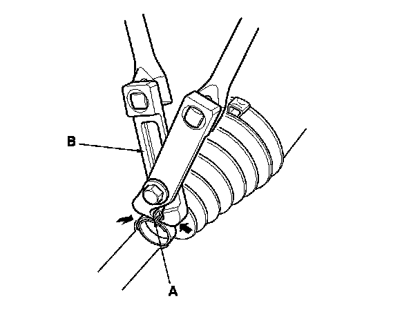 21. Check the hook portion of the band using commercially available boot band pliers (A), then hook the tabs (B) of the band.