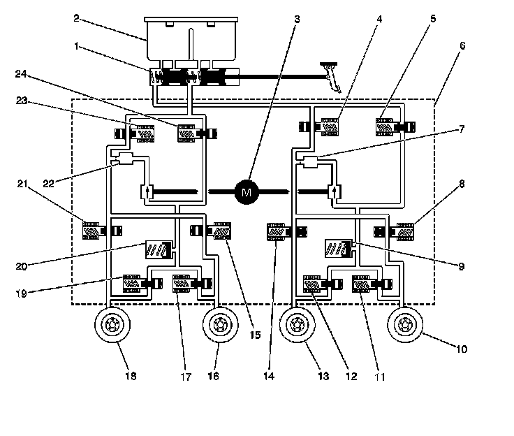 ^ Brake Pressure Modulator Valve (BPMV) - The BPMV contains the hydraulic valves and pump motor that are controlled electrically by the EBCM. The vehicle is equipped with traction control The BPMV uses a 4 circuit configuration with a front/rear split. The BPMV directs fluid from the reservoir of the master cylinder to the front wheels and fluid from the other reservoir to the rear wheels. The circuits are hydraulically isolated so that a leak or malfunction in one circuit will allow continued braking ability on the other.
