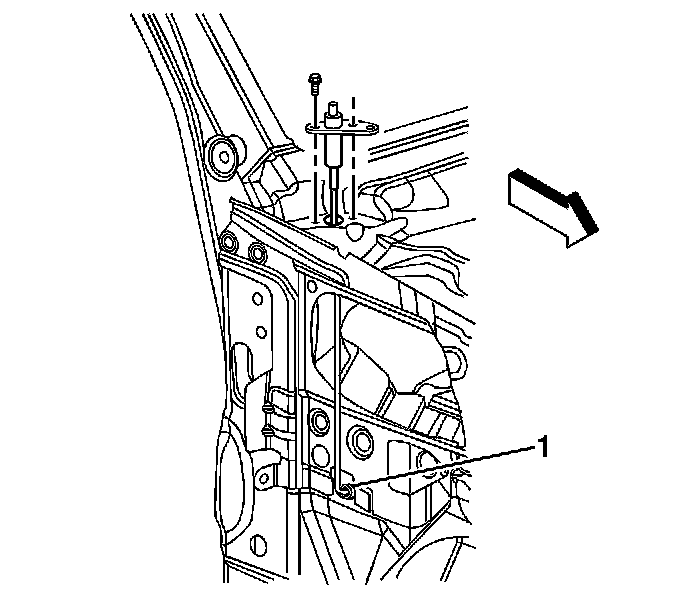 2. Pull on the mechanics wire to route the cable and grommet (1) through the hinge pillar.