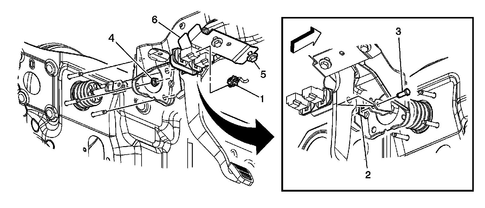 3. Install the mounting bolts (4) for the brake pedal assembly (6).